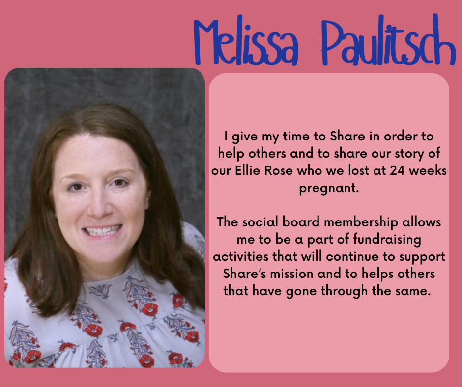 The primary objective of the Share Pregnancy & Infant Loss Social Board, comprised of dedicated professionals, is to raise awareness for the mission of Share. A member of the Social Board is responsible for organizing and promoting fundraising events, recruiting new volunteers, and attracting additional supporters..