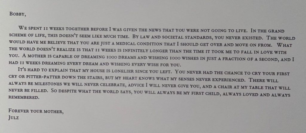 I decided to write this letter to Bobby the week I found out I was pregnant again. I took a leap of faith and included it in my baby announcement. Bobby never had an announcement, and she deserved one.